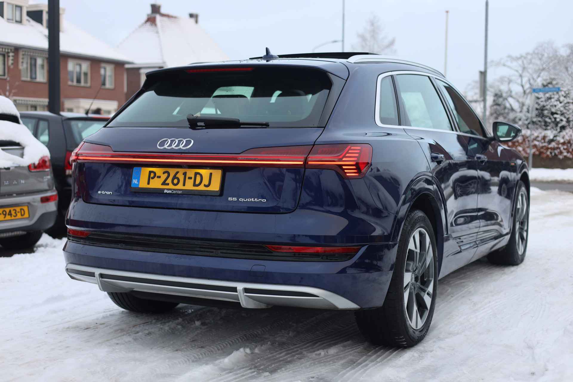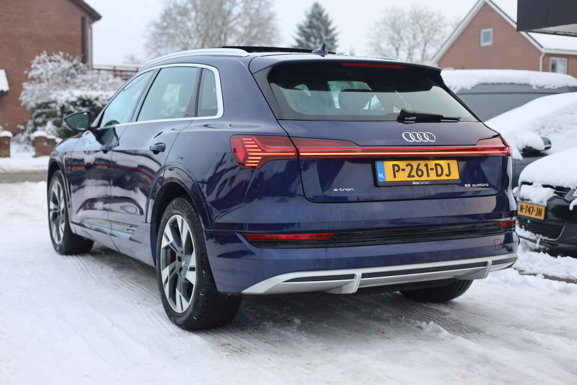 Hij biedt volop ruimte, deze Audi e-tron, en dankzij zijn elektrische aandrijving is er ook plenty vermogen voor een dynamische rijstijl. Deze auto is van het bouwjaar 2020 en heeft 48905 kilometer gelopen. Gas geven is er met de elektromotor niet meer bij. Stil snelheid maken wel! De krachtige motor geeft deze Audi uitstekende prestaties. De luchtvering biedt veel pluspunten, variërend van optimaal wegcontact en aerodynamica, tot en met constante rijhoogte en uitstekende demping van oneffenheden. Een weldaad voor u en uw bijrijder: deze Audi e-tron heeft verwarmbare voorstoelen. Ziet er goed uit, die sportstoelen. Maar waar het om gaat, is de solide zit onder alle omstandigheden. Het elektrisch bediende glazenpanorama dak zorgt voor licht en gevoel van ruime. Een praktische extra is de elektrisch bedienbare achterklep die opent en sluit met een druk op de knop. Laat de koude dagen maar komen. Bij u zitten ze zelfs achterin goed, dankzij de verwarmde achterbank. In deze auto profiteert u onder andere ook van: 20 inch lichtmetalen velgen, LED koplampen, warmtewerend glas, in delen neerklapbare achterbank, LED-achterlichten en verstelbare lendensteunen.