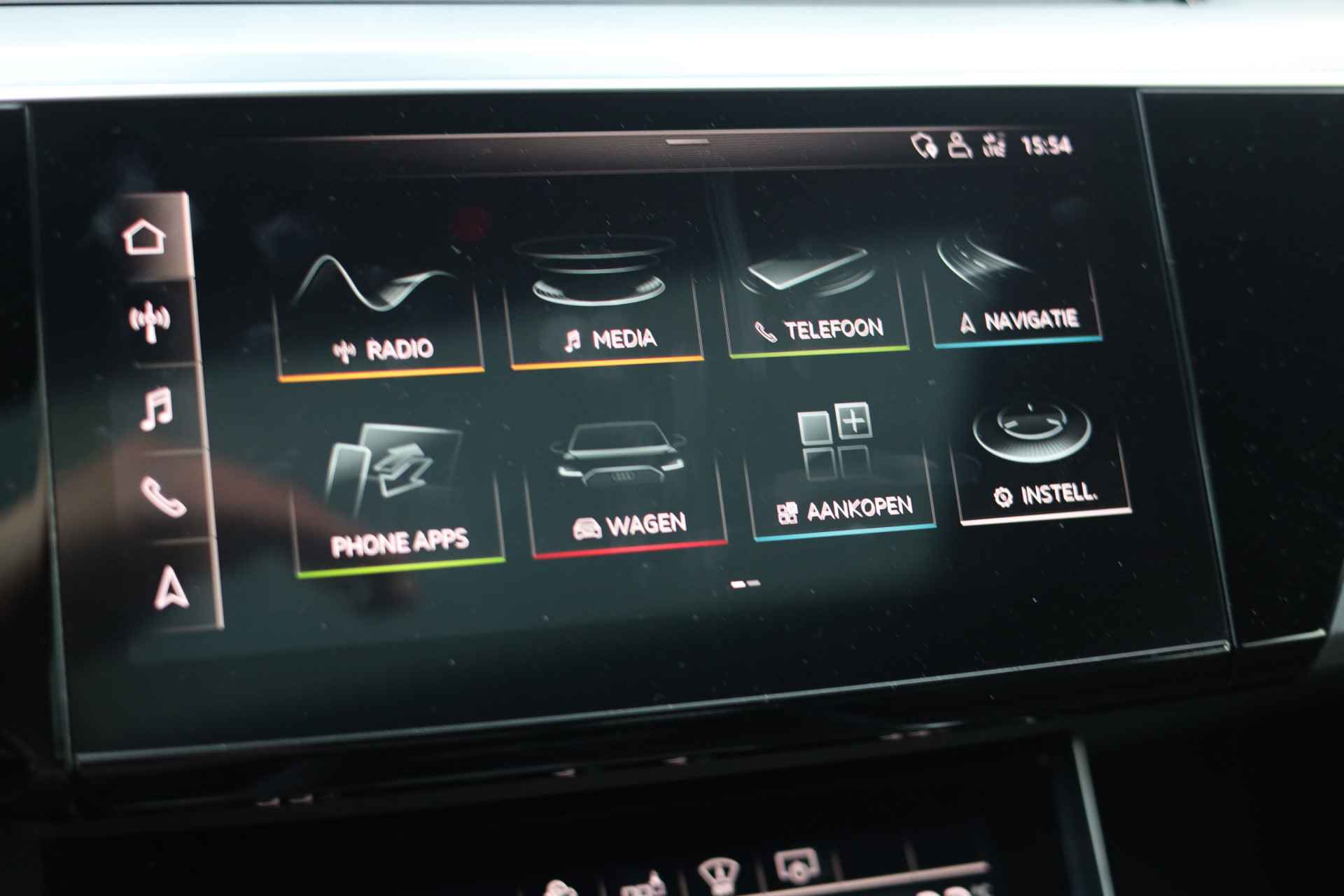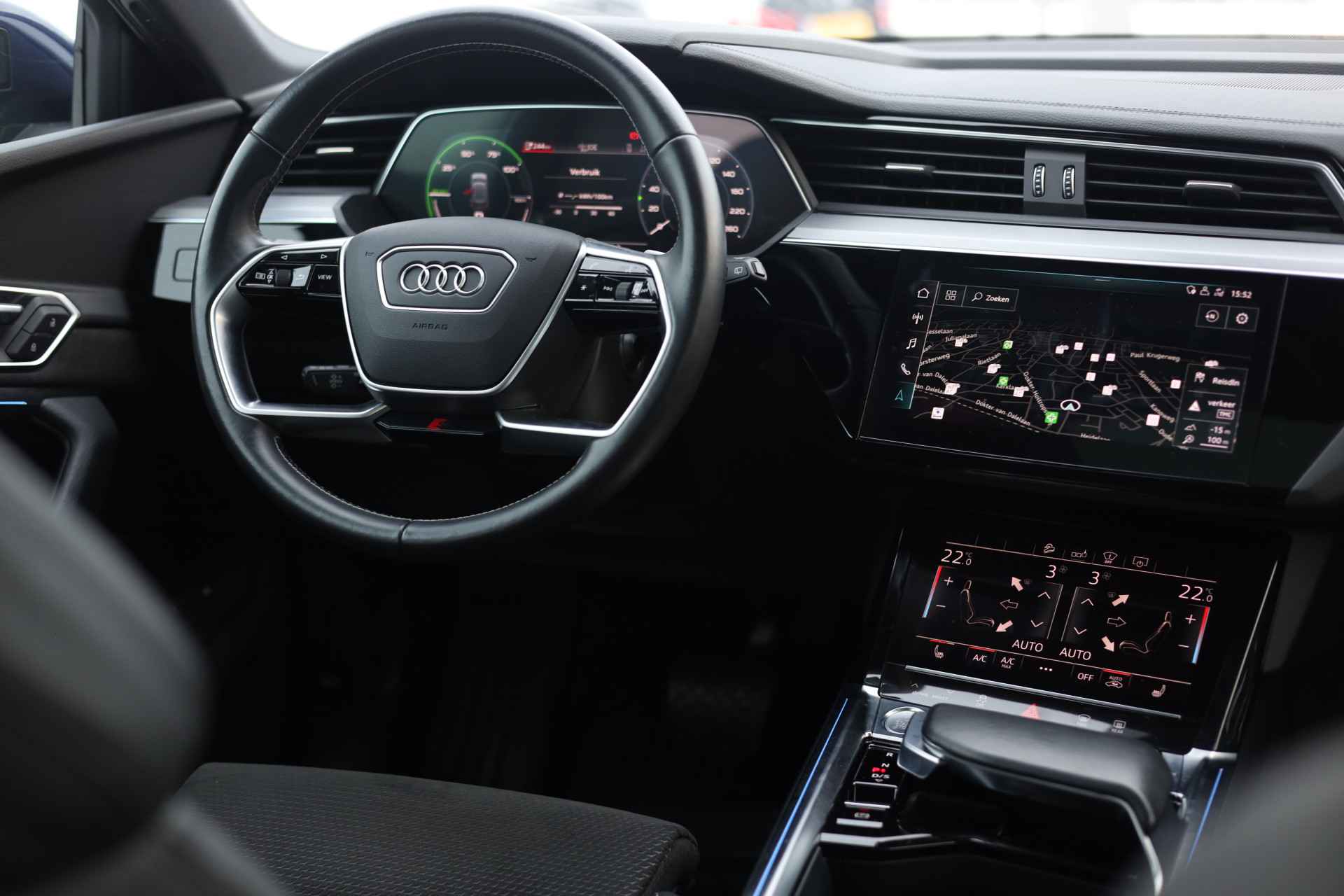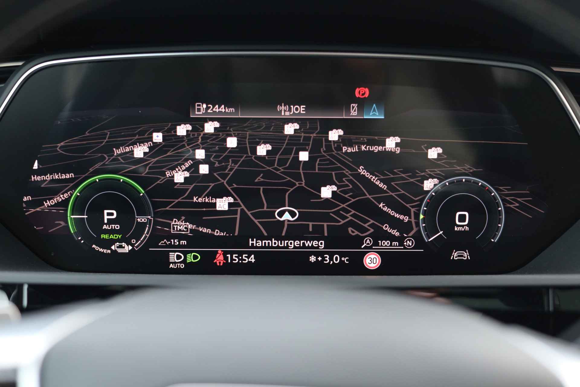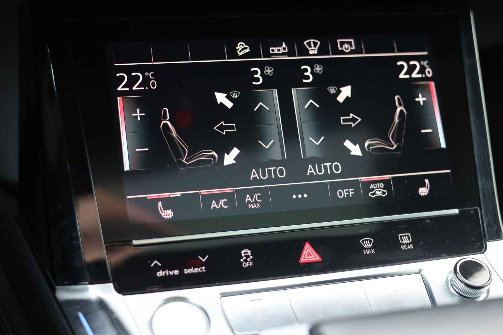 Rij- en route-info wordt perfect in beeld gebracht door het digitale dashboard. Onder alle omstandigheden perfect zicht op wat zich achter de auto afspeelt: de achteruitrijcamera zorgt ervoor! Met adaptive cruise control houdt deze auto automatisch afstand tot uw voorligger. Rijden-stilstaan, rijden-stilstaan. Niks is irritanter en vermoeiender dan filerijden. Daar heeft deze Audi e-tron een oplossing voor: de file assistent, die met radarmeting permanent het tempo aanpast op de voorligger. Zelfs als die stopt. Gemak dient de mens. Dankzij de spraaksturing bedient u de belangrijkste functie met uw stem. De uitrusting van deze auto is met connected drive services, premium audiosysteem, full map navigatiesysteem, electronic climate control, schakelpaddles aan het stuur en draadloos opladen behoorlijk compleet.
