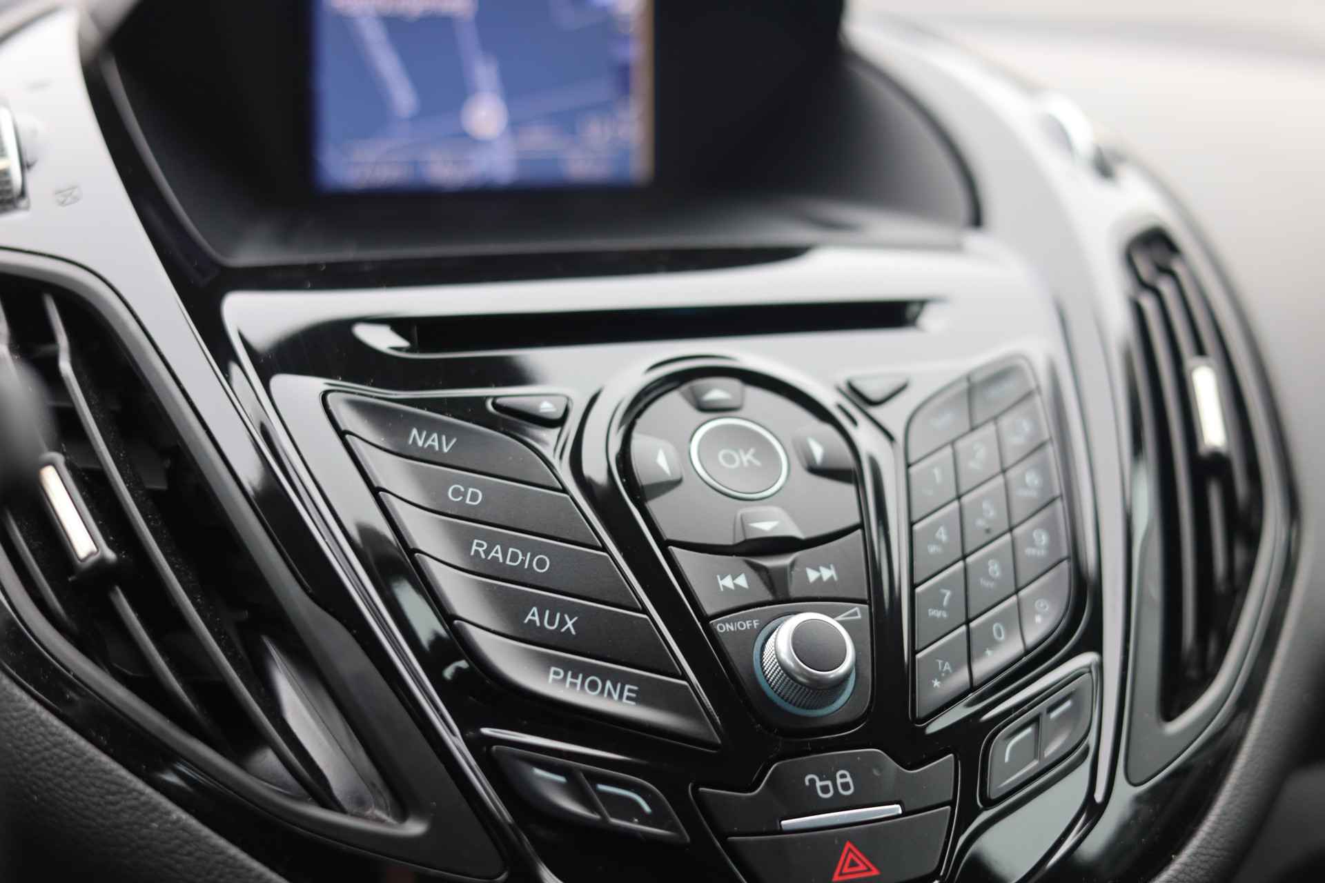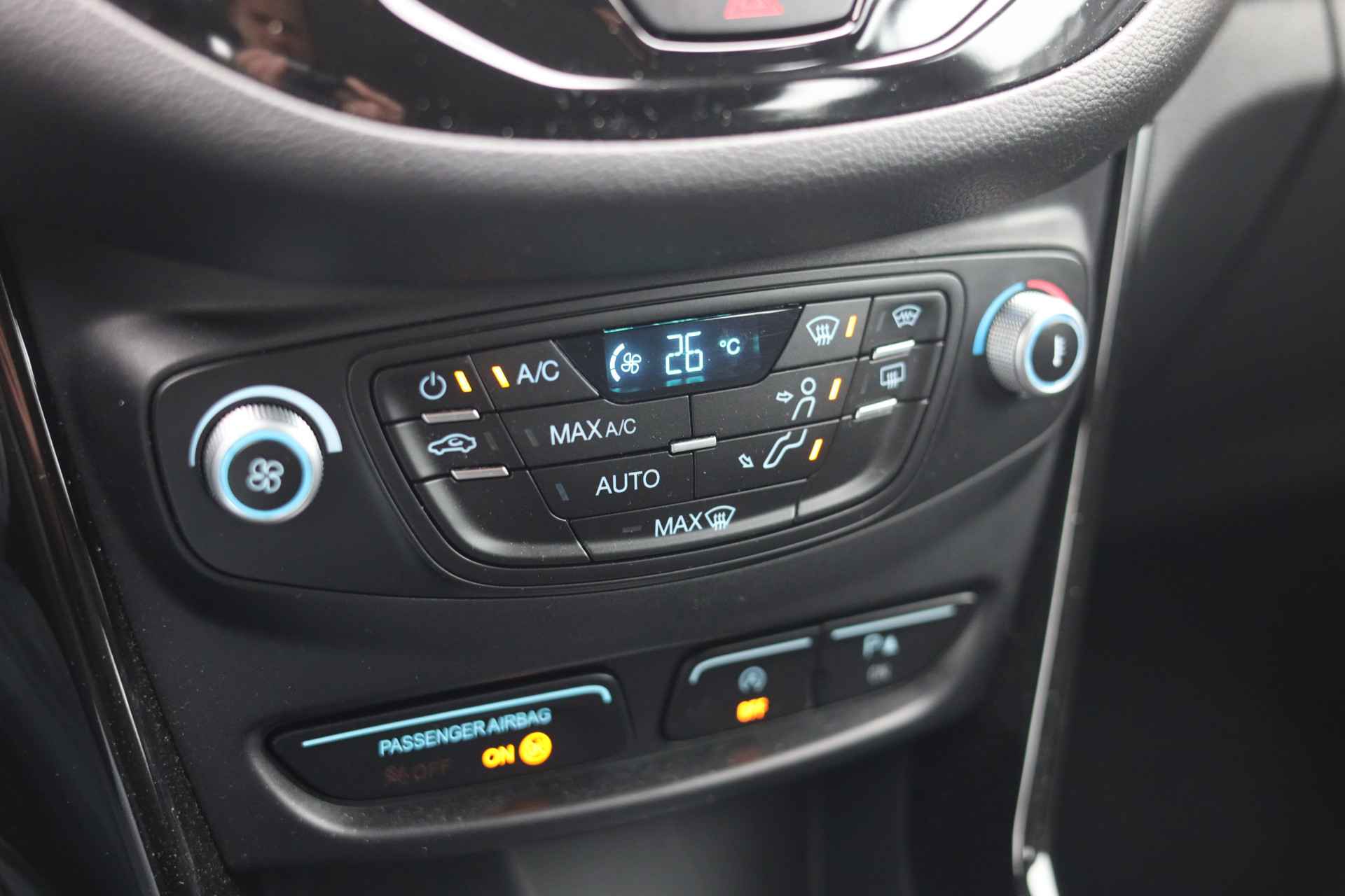 De achteruitrijcamera laat duidelijk zien hoeveel ruimte u nog heeft bij het inparkeren. Audio-installatiesysteem en navigatiesysteem zijn gecombineerd. Zo wordt zelfs gesproken route-informatie een luisterervaring! En dankzij bluetooth klinkt uw favoriete playlist geweldig. Automatische airconditioning verwarmt of koelt het interieur met een druk op de knop. Het drukke verkeer eist onderweg al uw aandacht op. Daarom is het goed dat deze Ford is voorzien van diverse systemen die u assisteren tijdens de rit. Een automatisch inschakelbare verlichting neemt het waar als het donker wordt of gaat schemeren, en schakelt dan automatisch de verlichting in. Op dezelfde manier "ziet" de regensensor de eerste spatjes regen en schakelt dan de ruitenwissers in, en als het harder gaat regenen zet hij de ruitenwissers ook in een snellere stand. Meer rijcomfort en minder brandstofgebruik? Even de cruise control instellen en dan ontspannen rijden! En deze auto heeft ook dashboard met spraakbediening, DAB ontvangst, automatisch dimmende binnenspiegel, lederen stuur, centrale deurvergrendeling met afstandsbediening en boordcomputer als standaard uitrusting.