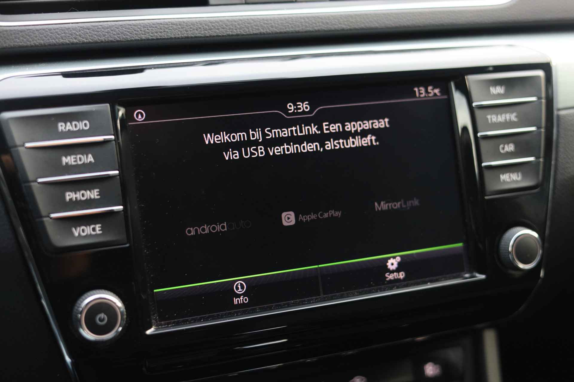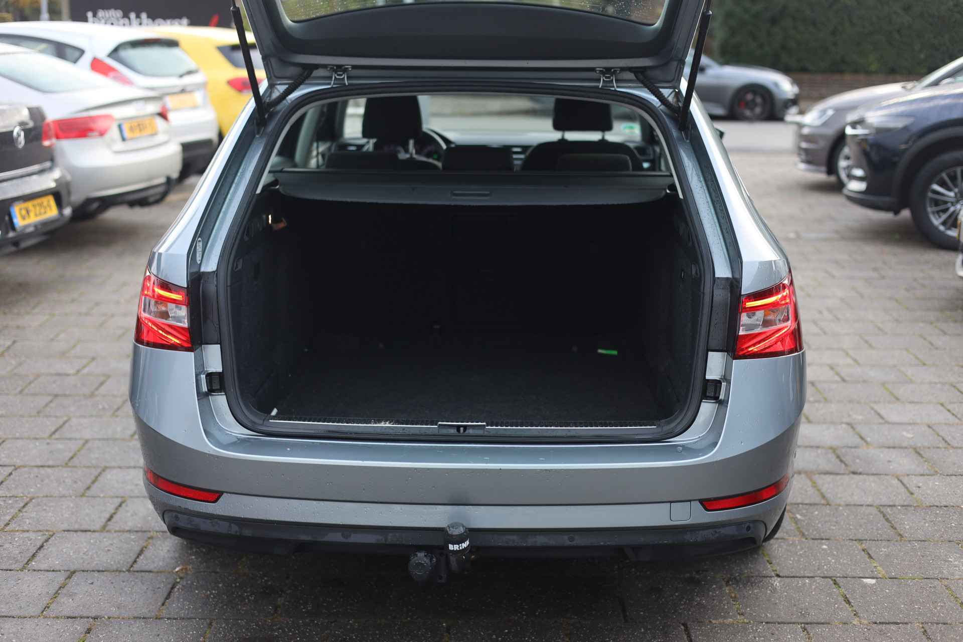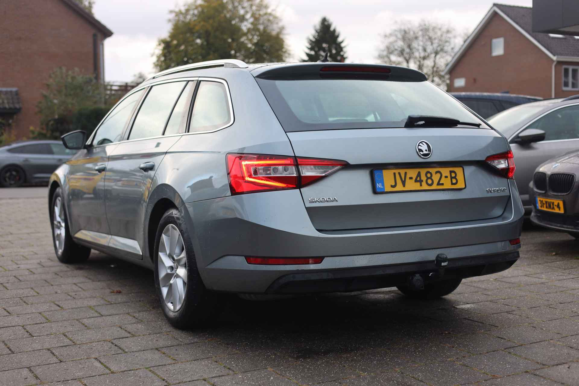Een optie die de veiligheid verhoogt, is de bediening vanaf het stuur van het audiosysteem (met DAB-radio!) en het navigatiesysteem. Deze ŠKODA Superb Combi is een complete auto anno nu, en dat merk je. Bijvoorbeeld door de aanwezige draadloze oplaadmogelijkheid voor telefoons. Tot de standaard uitrusting van deze auto hoort ook automatische airconditioning. Geen parkeervak is te klein dankzij de assistentie van de parkeersensoren. De automatisch inschakelbare verlichting en regensensor zorgen dat onderweg automatisch de verlichting en de ruitenwissers worden ingeschakeld. Daarmee nemen ze u veel werk uit handen. Extra opties op deze auto zijn: cruise control, automatisch dimmende buitenspiegels, lederen stuur, centrale deurvergrendeling met afstandsbediening en lederen versnellingspook.